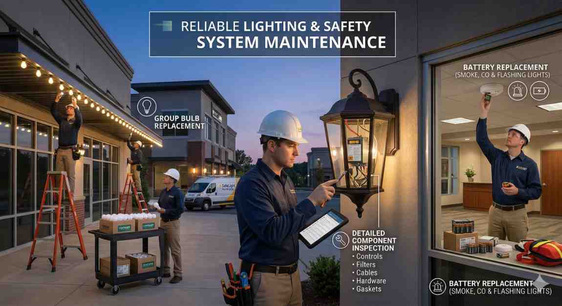 Our team regularly replaces bulbs in groups for efficiency and inspects transformer controls, filters, baffles, cables, hardware, and gaskets on exterior lights. We also replace batteries in smoke detectors, carbon monoxide detectors, and flashing lights to maintain safety