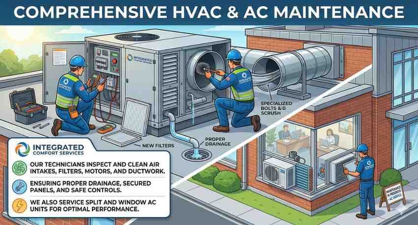 Our technicians inspect and clean air intakes, filters, motors, and ductwork, while ensuring proper drainage, secured panels, and safe controls. We also service split and window AC units for optimal performance