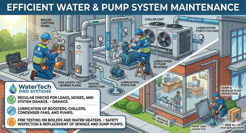 We regularly check for leaks, noises, and damage in water systems. Our team lubricates boosters, chillers, condenser fans, and pumps, performs fire testing on boilers and heaters, and inspects sewage and sump pumps, replacing them when necessary.