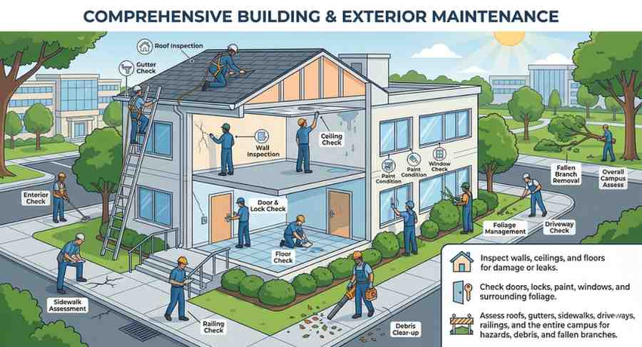 We inspect walls, ceilings, and floors for damage or leaks, check doors, locks, paint, windows, and surrounding foliage, and assess roofs, gutters, sidewalks, driveways, railings, and the entire campus for hazards, debris, and fallen branches.